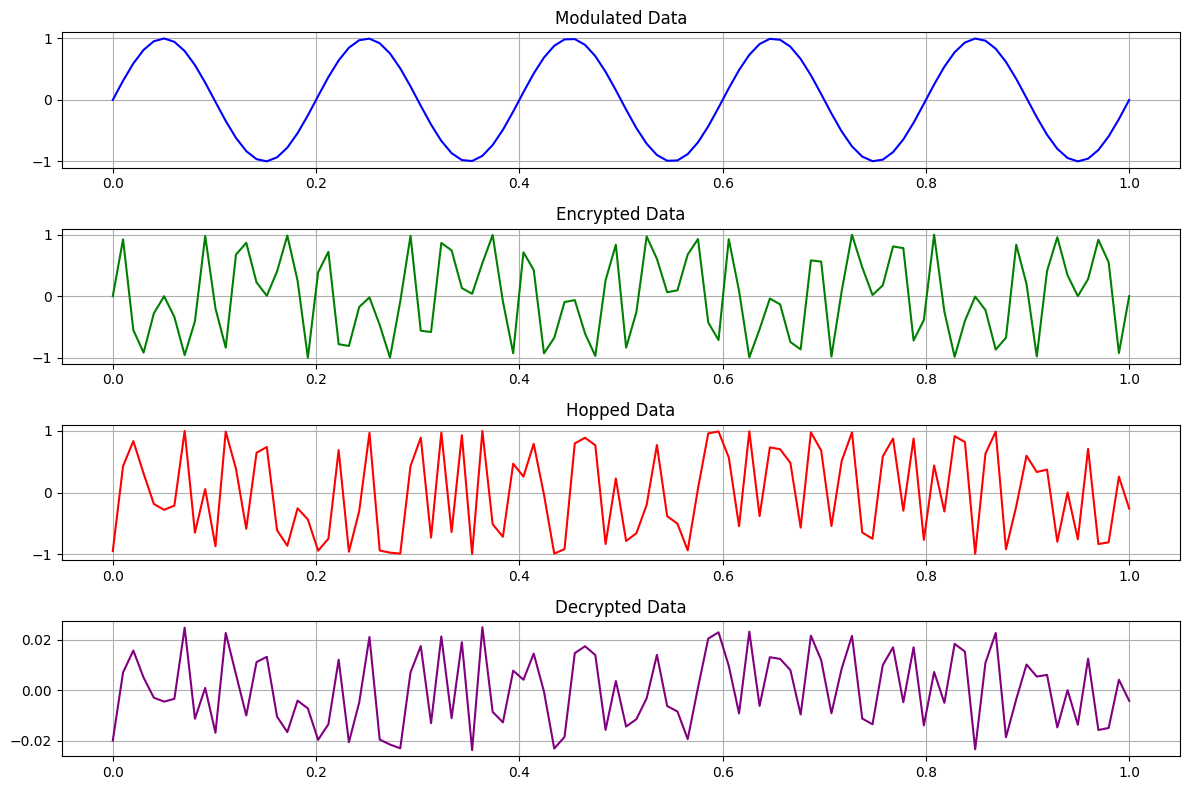This application presents the complete lifecycle of a secure signal transmission process, from modulation and encryption to frequency hopping and decryption. By visualizing each stage in a clear, sequential format, it enables users to understand how signals are transformed, secured, and recovered throughout the communication pipeline. The platform is ideal for illustrating signal protection concepts, assessing transmission integrity, and evaluating the performance of adaptive communication systems.
